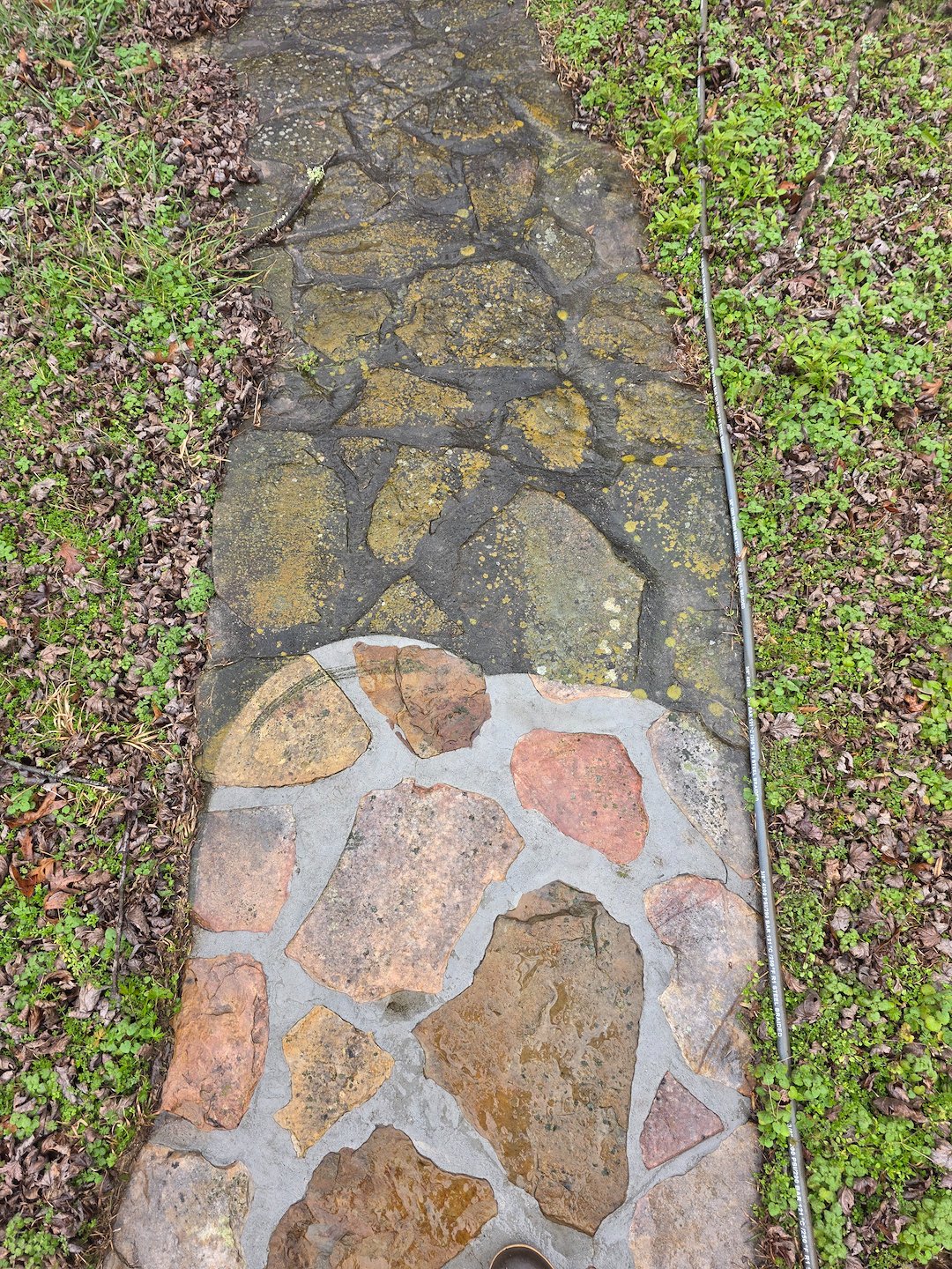 Next we set up our pressure washing equipment and took steps to protect nearby plants and surfaces. Using the appropriate pressure settings for rock surfaces, we cleaned the walkway in sections so we could monitor results and avoid damage. Our approach focused on removing the slippery residue while preserving the texture and appearance of the rock.