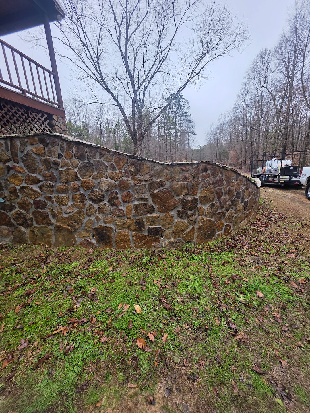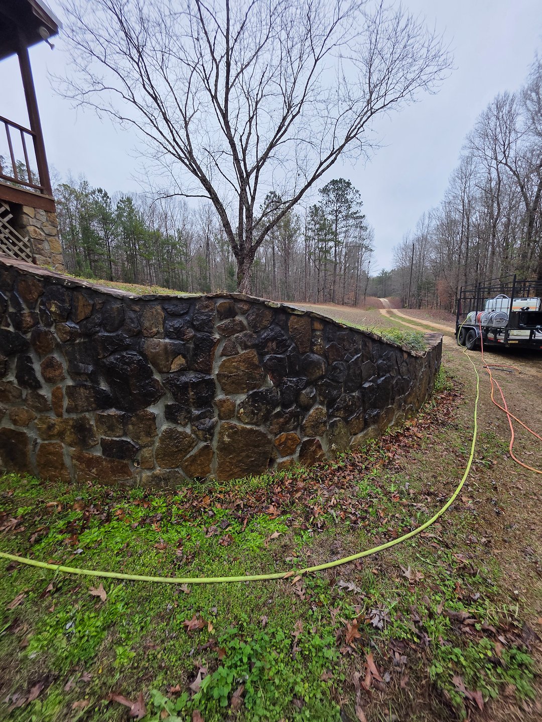 A homeowner in Opelika, AL called Flyway Wash Company because she was tired of looking at her dirty rock retaining wall. The wall had a noticeable build up of organic material, and she wanted a safe, effective way to restore its appearance without damaging the stone or nearby landscaping. We scheduled the job and brought our soft washing equipment to the property to address the problem.