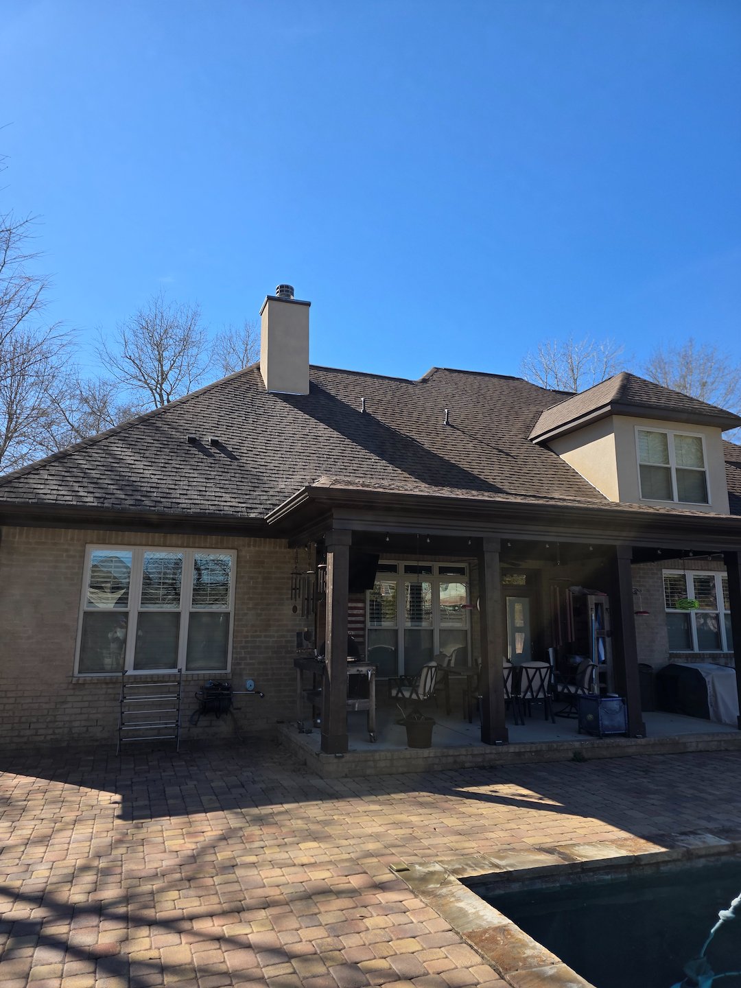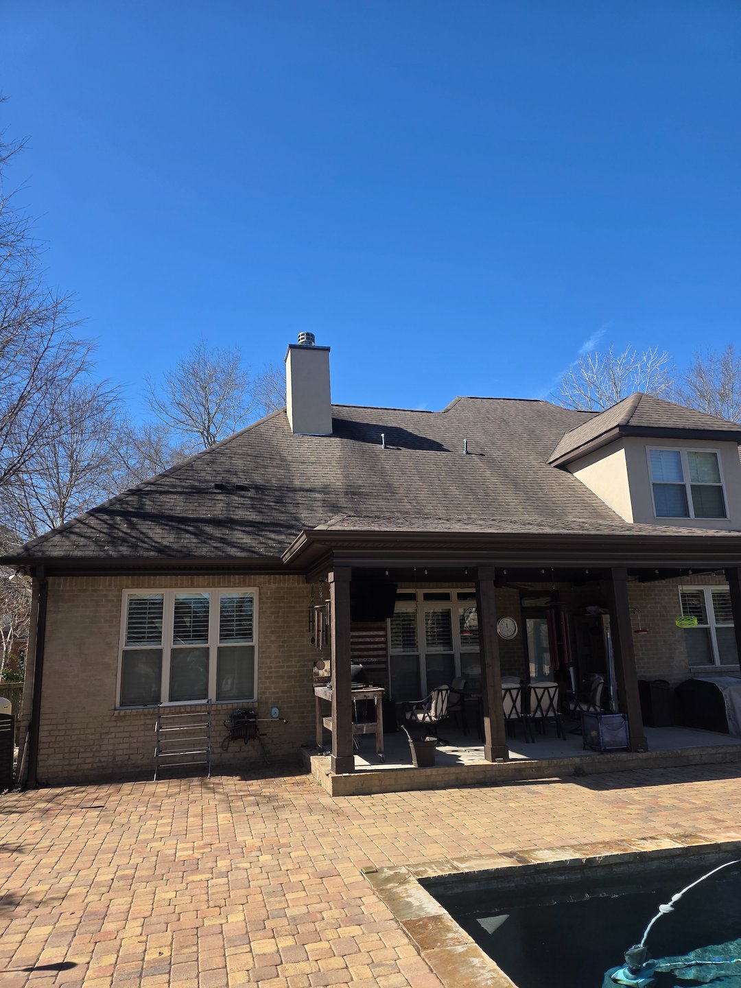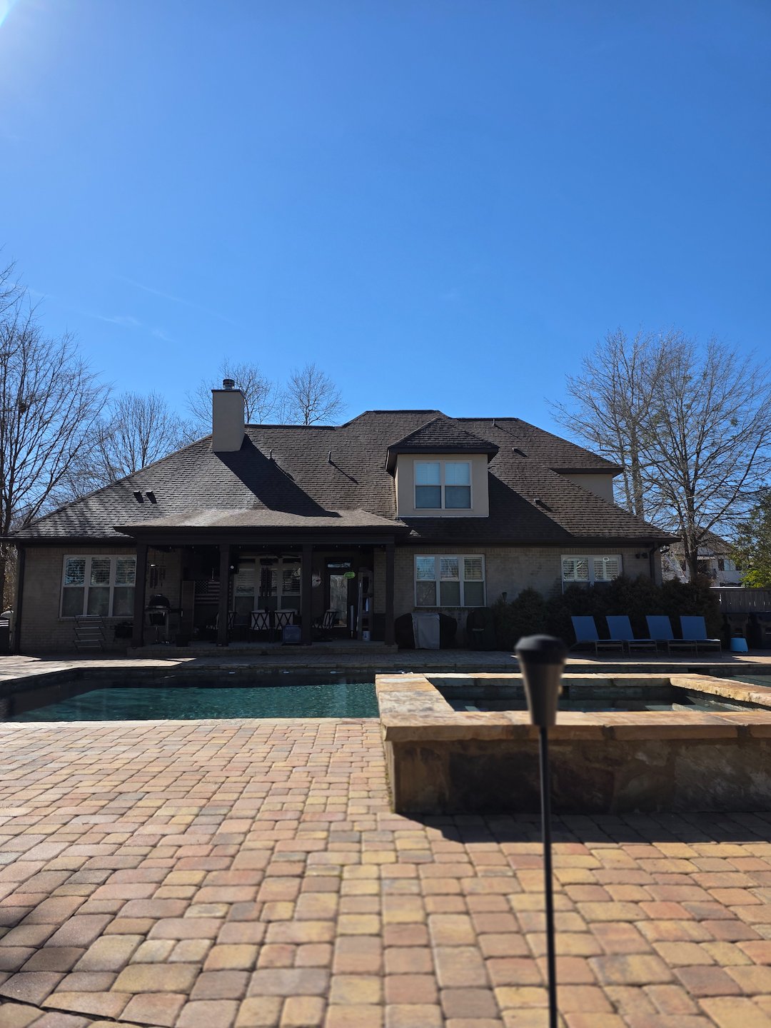 Our team used softwash techniques and equipment designed for low-pressure application, which helps clean roofing materials without the force of high-pressure washing. The method we used targets the biological growth and staining on the surface, while minimizing stress on shingles and other roofing components. Our experienced operators monitored pressure and application closely throughout the job to keep everything safe.